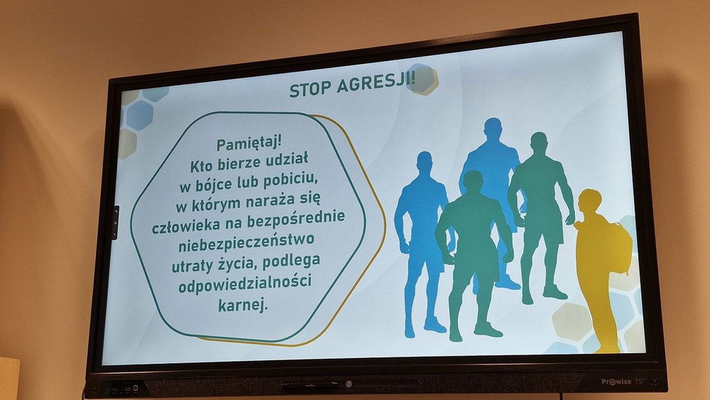 Podczas zajęć dzieci w grupach rozwiązywały zadania dotyczące cech dobrego i złego kibica, segregowały obrazki przedstawiające przedmioty do wniesienia na stadion i te zabronione oraz tworzyły ilustracje z hasłami Doping bez przemocy i Kibicuj z klasą. Omówiono konsekwencje łamania prawa przez nieletnich, zjawisko demoralizacji oraz niebezpieczeństwa związane ze środkami pirotechnicznymi.