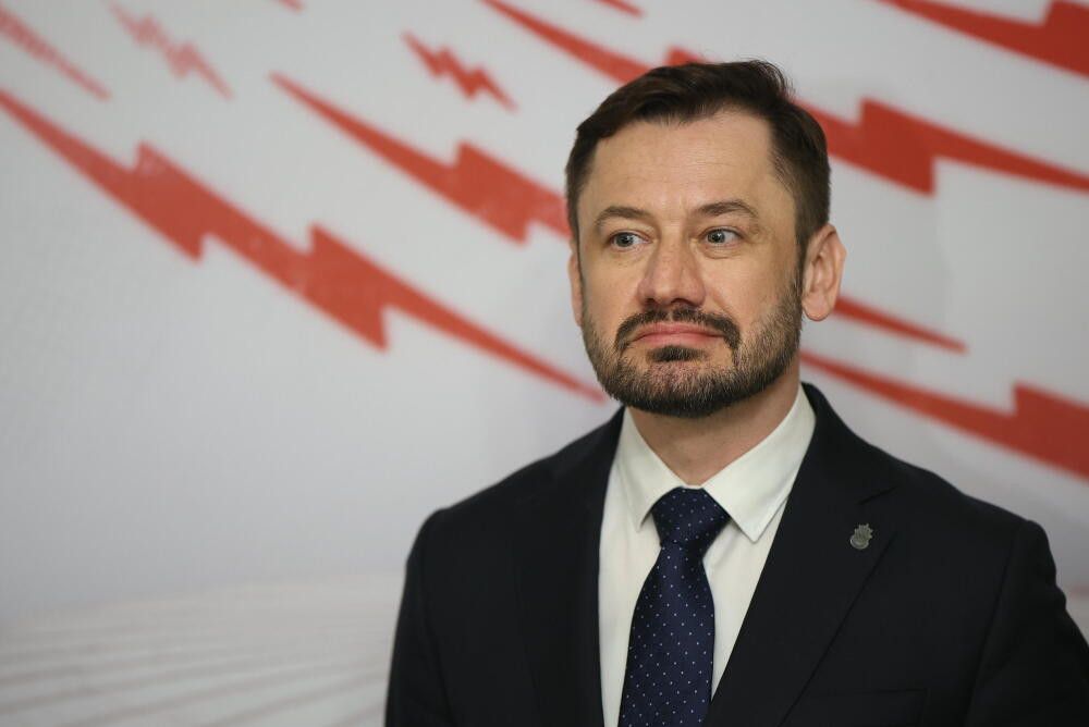 Kraków, 02.03.2026. Prezydent Krakowa Aleksander Miszalski podczas konferencji prasowej w Krakowie, 2 bm. Konferencja dotyczyła organizacji Mistrzostw Świata w siatkówce, które odbędą się w dniach 10-26 września 2027 roku w pięciu polskich miastach. W Krakowie rozegrane zostaną mecze finałowe turnieju. (mk) PAP/Łukasz Gągulski
