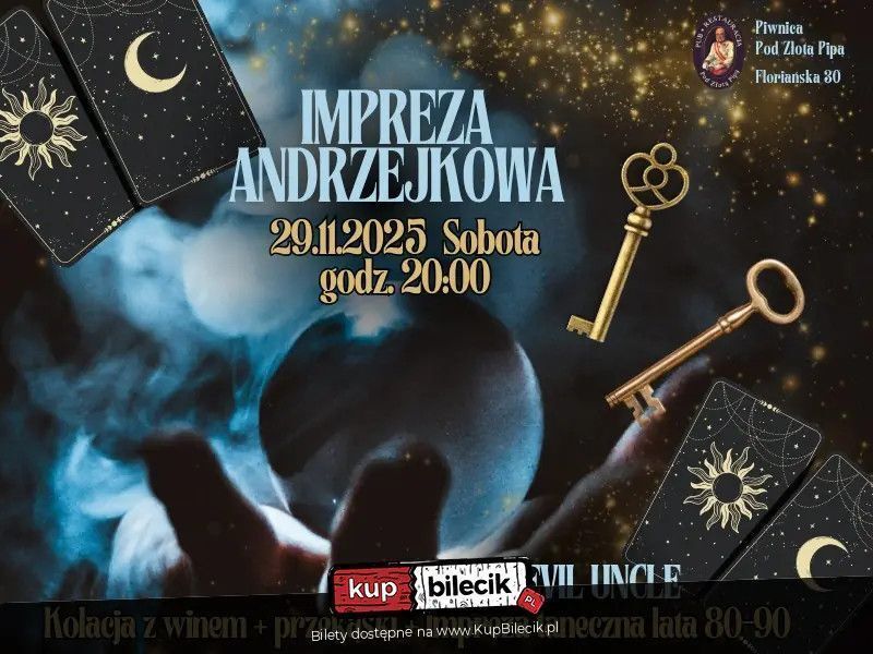 A za konsoletą... legendarny DJ Evil Uncle - gwarancja parkietu pełnego do rana! Niech ta andrzejkowa noc będzie pełna magii, tańca i niezapomnianych wspomnień. Zarezerwuj datę - 29 listopada 2025! Liczba miejsc ograniczona!