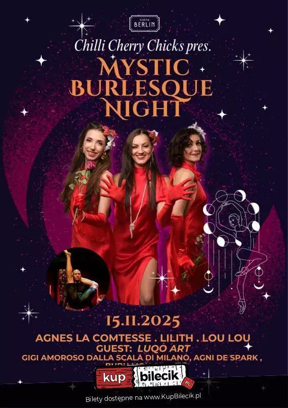 Na scenie pojawią się niepowtarzalne Chilli Cherry Chicks - w tajemniczej rewii burleski, gdzie każdy taniec staje się zaklęciem, a każdy gest - magią uwodzenia. Burleskową gościnią specjalną będzie Mila de Villa gwiazda o płomiennym temperamencie, a całość poprowadzi z klasą i finezją charyzmatyczny Chrubino Serafini. Muzycznym dopełnieniem będzie wyjątkowy występ Gigi Amoroso dalla Scala di Milano, który oczaruje publiczność swoim głosem prosto z włoskiej sceny marzeń.
