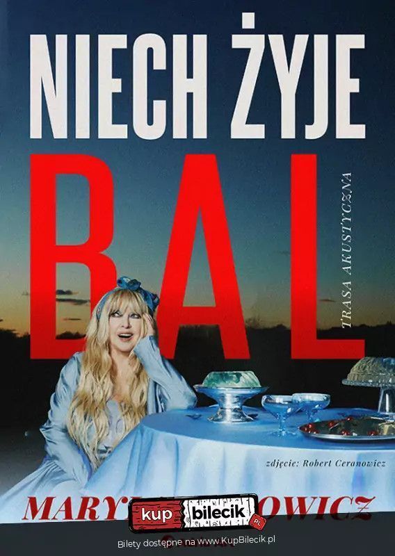 Największe przeboje Maryli Rodowicz na żywo! Podczas trasy "Niech żyje bal" artystka zaprezentuje wachlarz największych przebojów: od "Małgośki" i "Remedium" po nieśmiertelny tytułowy hymn. Tym razem jednak usłyszymy te utwory w zupełnie nowym wydaniu. Akustyczne aranżacje podkreślą urok melodii, niepowtarzalną barwę głosu artystki i ten magiczny element, który sprawia, że jej piosenki zawsze brzmią wyjątkowo, mimo upływu lat. Spotkanie z Marylą Rodowicz to więcej niż koncert - to bal, w którym każdy refren wywołuje wspomnienia. Niezależnie od wieku i muzycznych upodobań trudno oprzeć się atmosferze wydarzenia, które niezmiennie udowadnia, że prawdziwa gwiazda świeci nieprzerwanie. Nie przegap tej okazji, by poczuć na własnej skórze magię sceny, której królową od lat pozostaje Maryla.
