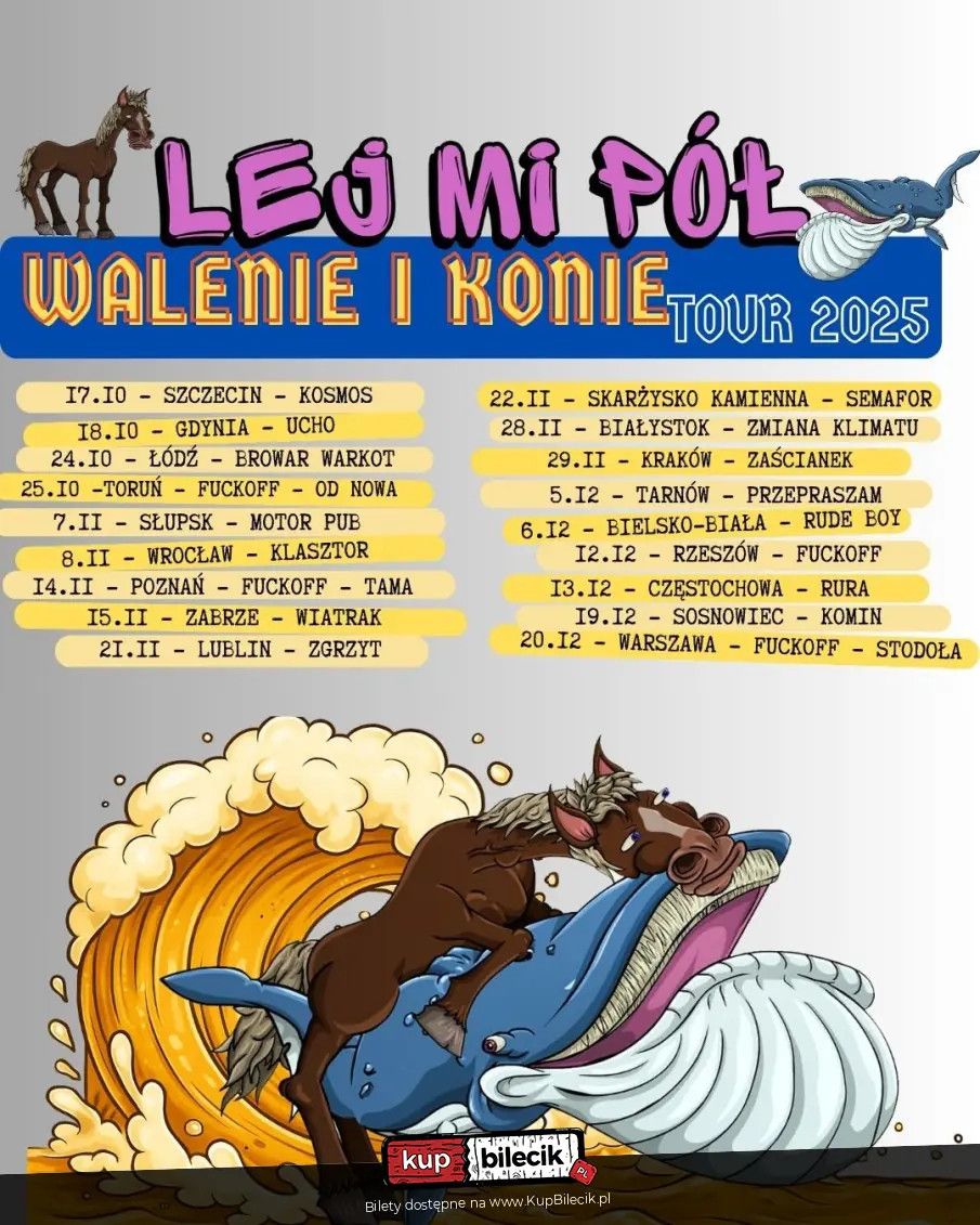 bilety: Pamiętasz, jak kiedyś kupiłeś bilet na wymarzony koncert ulubionego zespołu? Pamiętasz tę ekscytację, poziom podniecenia? Koncert startował o dwudziestej, ale Ty zapomniałeś się nie naj*bać i jedyne co pamiętasz to taksówkarza z drogi powrotnej który w bliżej nieznanym Tobie języku, opowiadał coś o swoich morskich podbojach gdy służył w Marines. To jest taki rodzaj wojsk: piechota morska, nie mylić z marynarką wojenną bo to jest ku*wa co innego. Wiadomo, w Polsce nie mamy Marines, ale mamy marynarkę. Prawdopodobnie w kraju z którego pochodzi ów taksówkarz nie ma również tych jednostek. Ale co jest ważne w tej historii? Otóż pamiętasz gdy już dotarłeś do domu po felernym Gigu, porzygałeś się na krawężnik i zdałeś sobie sprawę, dotarło to do Ciebie, było jak oświecenie, afirmacja światła, błogosławieństwo narodzin, myśli człowieczeństwa: żeby być w piechocie morskiej trzeba być trochę waleniem i trochę koniem. Potem zwaliłeś na środku drogi i poszedłeś spać. Zapraszamy wszystkich na trasę, która powinna się nie odbyć, ale odbędzie się. Tak wiemy, mieliśmy robić nową płytę... Ale kto nas sprawdzi? Normalne kapele piszą w tym miejscu: do zobaczenia, my wolimy: powodzenia! Lej mi Pół artyści: Lej mi PółLej Mi Pół - zespół z Bielska Białej, grający powierzchowny punk-rock oraz metal w cienkim cieście. Nat Osborn Band utworzony pod koniec 2011 roku, zespół szybko wyrobił sobie markę na nowojorskiej scenie muzycznej oraz w Northeast. Od tego czasu zespół zagrał ponad 150 koncertów, w tym dwie trasy koncertowe w Europie oraz dwie w USA- będąc gwiazdami mniejszych festiwali muzycznych na obu kontynentach. Bilety do nabycia na: KupBilecik.pl |