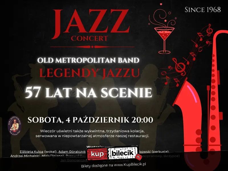 bilety: Z okazji 57-lecia działalności zespołu zapraszamy na niezapomniany wieczór pełen klasy, doskonałej muzyki i wykwintnych smaków! Old Metropolitan Band, najstarszy krakowski zespół jazzowy, zabierze Cię w fascynującą podróż przez świat klasycznego jazzu. Przygotuj się na rytmiczne brzmienia, pełne pasji improwizacje oraz niezwykły wokal, które na długo zapadną w pamięć. Wieczór uświetni również wykwintna, trzydaniowa kolacja serwowana w wyjątkowej atmosferze naszej restauracji. Spędź ten wieczór w wyjątkowy sposób - otoczony niezapomnianymi dźwiękami, smakowitymi potrawami i ciepłą, rodzinną atmosferą. Serdecznie zapraszamy na to wyjątkowe wydarzenie! Wystąpią: Przystawka: Danie główne mięsne: Danie główne wegetariańskie: Old Metropolitan Band artyści: Adam Góralczyk, Ryszard Kwaśniewski, Tadeusz Oferta, Jan Gaciarczyk, Wiktor KierzkowskiNiekonwencjonalny zespół jazzowy, od chwili powstania w 1968 roku, do dzisiaj fascynuje swoją pełną temperamentu muzyką. Nie tylko w Polsce, ale i poza granicami, OMB szybko awansował do grona najbardziej ulubionych dixielandowych formacji. Po latach istnienia, krakowska grupa nic nie straciła ze swojej przysłowiowej witalności i tryskającego energią "drive"u". Niekonwencjonalny jest też jej repertuar. Od standardów jazzu tradycyjnego, poprzez znane "evergreens", jak Route 66, Hit the Road Jack, Summertime, aż po ujazzowioną przez nią wersję Sway… Bilety do nabycia na: KupBilecik.pl |