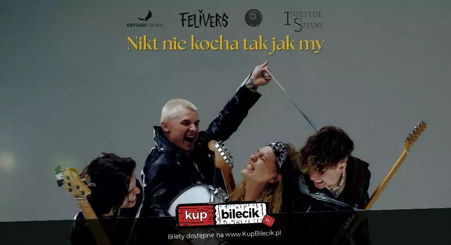 bilety: Niech ta jesień nas nie usypia, a nas wszystkich obudzi, bo "Nikt nie kocha tak jak my"! To nie jest czas na chowanie się pod kocem. To jest moment, by poczuć że żyjemy, żyjemy jeszcze bardziej. Będziemy krzyczeć o tym, co boli, i śpiewać o tym, co piękne, wzruszać się, tańczyć i bawić się. Przyjdź i bądź częścią tego z nami. Do zobaczenia! Felivers artyści: Miłosz Fergiński, Konrad Jażdżyk, Piotr "Cody" Dąbrowski, Wojciech FortunaRockandrollowa energia, świeżość i charyzma to tylko niektóre z wielu określeń pasujących do zespołu Felivers, który gra muzykę pop punk/pop rock. Garażowy band, dzięki swojej oryginalności, zagrał wiele koncertów na prestiżowych arenach i scenach, takich jak PGE Narodowy, Debiuty w Opolu oraz preselekcje do Eurowizji. W skład zespołu wchodzą: Miłosz Fergiński (wokal, gitara), Konrad Jażdżyk (wokal, bas), Piotr "Cody" Dąbrowski (wokal, gitara) oraz Wojciech Fortuna (perkusja). Bilety do nabycia na: KupBilecik.pl |