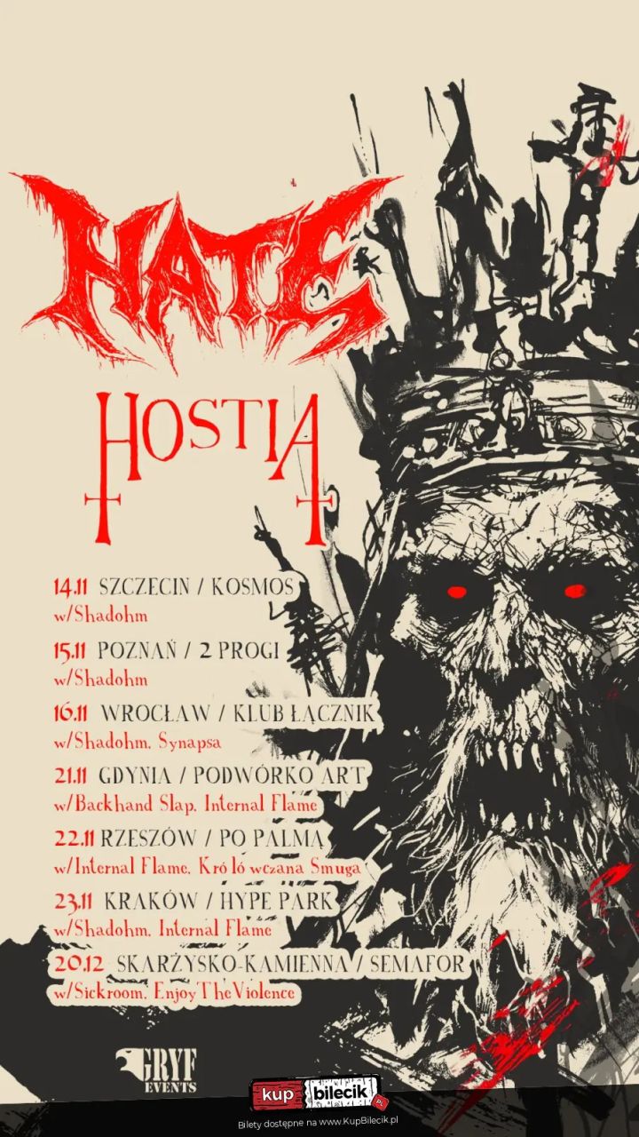 Ekipa Gryf Events ma kolejny cios. Tym razem jest to trasa absolutnych gigantów metalu. Zespół Hate oraz Hostia zapraszają na wspaniałą ucztę muzyczną, podczas 6 niezapomnianych sztuk w Polsce, gdzie prezentowane będą nowe albumy.