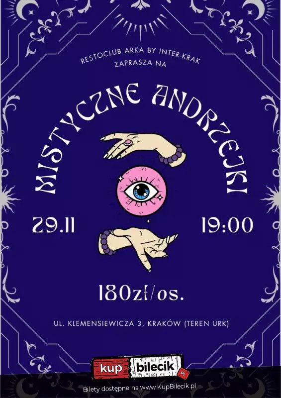 bilety: Odkryj swoje najskrytsze tajemnice i baw się świetnie w ezoterycznym klimacie balu andrzejkowego! Już 29 listopada 2025 r. zapraszamy na niezapomniany wieczór pełen magii, tajemnic i dobrej zabawy! Mistyczne Andrzejki w RestoClub Arka by Inter-Krak to wydarzenie, które łączy tradycję wróżb z wyjątkową atmosferą i kulinarną ucztą. Andrzejki 2025 artyści: Różni artyściZanurz się w magiczny klimat jednej z najbardziej kultowych piwnic Krakowa! W historycznych murach Piwnicy pod Złotą Pipą szykujemy niezapomnianą, taneczną noc pełną emocji i hitów sprzed lat. Bilety do nabycia na: KupBilecik.pl |
