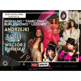 bilety: Wieczór z Burleską ANDRZEJKI. WOKALNO TANECZNO BURLESKOWO LEDOWY SHOW Wystąpią: Wieczór z Burleską artyści: Veren De Heddge, Babsi Bonèr, Lilith, LouLouKochasz to co ekscytujące i zaskakujące Lubisz zatopić się w dźwiękach, a przy tym doświadczyć czegoś wizualnie niesamowitego Zapraszamy na wieczór z burleską i drag show na najwyższym poziomie w samym sercu magicznego Krakowa. Zabierzemy Cię w świat elegancji, pełnego pasji, marzeń, które w tej jednej chwili staną się rzeczywistością. Będziesz smakować tę chwilę kawałek po kawałku, jednocześnie nie mając jej dość! Wydarzenie podzielone będzie na trzy części, w przerwie których będziecie mogli skosztować przepysznych koktajli serwowanych przez utalentowanych barmanów Chicago Bar. Bilety do nabycia na: KupBilecik.pl |