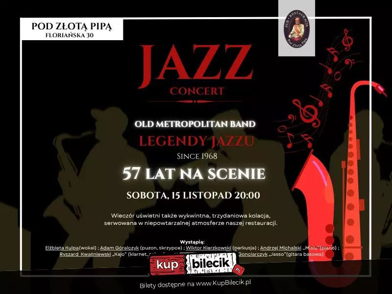 bilety: Z okazji 57-lecia działalności zespołu zapraszamy na niezapomniany wieczór pełen klasy, doskonałej muzyki i wykwintnych smaków! Old Metropolitan Band, najstarszy krakowski zespół jazzowy, zabierze Cię w fascynującą podróż przez świat klasycznego jazzu. Przygotuj się na rytmiczne brzmienia, pełne pasji improwizacje oraz niezwykły wokal, które na długo zapadną w pamięć. Old Metropolitan Band artyści: Adam Góralczyk, Ryszard Kwaśniewski, Tadeusz Oferta, Jan Gaciarczyk, Wiktor KierzkowskiNiekonwencjonalny zespół jazzowy, od chwili powstania w 1968 roku, do dzisiaj fascynuje swoją pełną temperamentu muzyką. Nie tylko w Polsce, ale i poza granicami, OMB szybko awansował do grona najbardziej ulubionych dixielandowych formacji. Po latach istnienia, krakowska grupa nic nie straciła ze swojej przysłowiowej witalności i tryskającego energią "drive"u". Niekonwencjonalny jest też jej repertuar. Od standardów jazzu tradycyjnego, poprzez znane "evergreens", jak Route 66, Hit the Road Jack, Summertime, aż po ujazzowioną przez nią wersję Sway… Bilety do nabycia na: KupBilecik.pl |