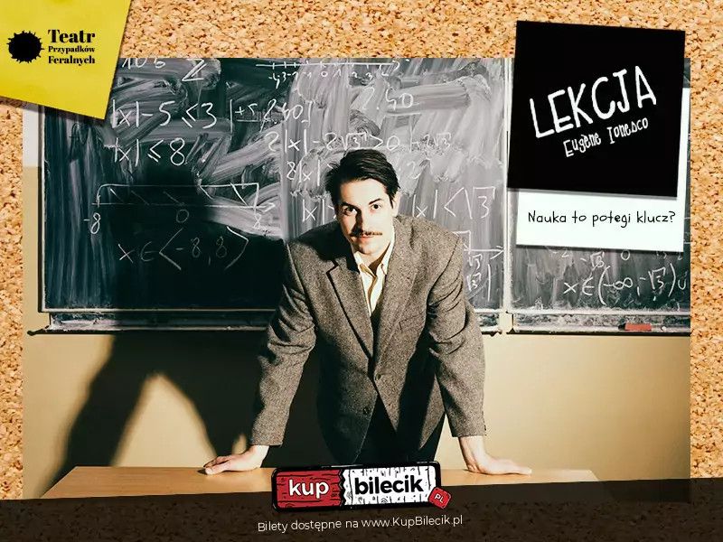 bilety: Bo nauka to potęgi klucz? Nigdy nie jest za późno na naukę. Trzeba jednak uważać, bo nadmierne zagłębianie się w niektóre tematy może prowadzić do nieoczekiwanych i niebezpiecznych rezultatów... Tak samo niespodziewanie toczy się akcja "Lekcji" w inscenizacji Teatru Przypadków Feralnych. Profesor, będący fanatykiem nauki, przyjmuje nową Uczennicę, której przeprowadza morderczy trening ciała i umysłu. Miejscem akcji staje się kartonowy świat, wypełniony znaczeniami wyłącznie poprzez intencje bohaterów. Twórcy spektaklu unikają ciężkiego klimatu - należy pamiętać, że komizm jest jedną z podstawowych zasad rządzących dramaturgią absurdystów. Nieoczywista sekwencja wydarzeń przeplata się tu z zabawnymi dialogami, opowiadając o niebezpieczeństwie, do którego potrafią doprowadzić skrajności - w tym radykalizm myśli i idei. To już kolejny sezon, w którym towarzyszy nam ,,Lekcja" Eugène"a Ionesco, wybitnego przedstawiciela europejskiego teatru absurdu. Spektakl cieszy się zainteresowaniem nie tylko krakowskiej publiczności, ale również miłośników teatru w całej Polsce. Od premiery, która odbyła się w lutym 2023 roku w Klubie Pod Jaszczurami gościliśmy na ogólnopolskich festiwalach m. in. na KKM m-teatr organizowanym przez Bałtycki Teatr Dramatyczny w Koszalinie oraz na Małym Festiwalu Form Artystycznych w Nowym Sączu. Ponadto ,,Lekcja" jest beneficjentem programu grantów Fundacji Lotto im. Haliny Konopackiej i została zaprezentowana podczas objazdu po województwie dolnośląskim (Zgorzelec, Milicz, Bielawa, Kłodzko). Profesor - Michał Orzyłowski Lekcja artyści: Michał Orzyłowski, Alicja Kurowska/Maria Pilch, Zuzanna Gac/Alicja KurowskaNigdy nie jest za późno na naukę. Trzeba jednak uważać, bo nadmierne zagłębianie się w niektóre z tematów może prowadzić do nieoczekiwanych i niebezpiecznych rezultatów… Tak samo niespodziewanie toczy się akcja "Lekcji" – najnowszej komedii Teatru Przypadków Feralnych. On – zwykły profesor. Ona – zwykła uczennica. Spotykają się w czasie indywidualnej lekcji. Co może pójść nie tak? "Lekcja" absurdalną sekwencją wydarzeń i zabawnymi dialogami opowiada o niebezpieczeństwie, do którego potrafią doprowadzić skrajności – w tym radykalizm myśli i idei. Przestawienie jest utrzymane w komediowej formule charakterystycznej dla twórczości Eugène’a Ionesco – wybitnego przedstawiciela europejskiego teatru absurdu. Bilety do nabycia na: KupBilecik.pl |