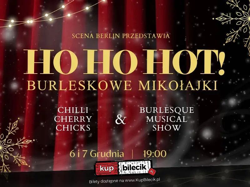 | HoHoHot! Burleskowe Mikołajki by Burlesque Musical Show & Chilli Cherry Chicksdodano 2025-11-13 19:13:19 Przygotujcie się na gorący, roztańczony wieczór, który rozpali zimową aurę! Scena Berlin, Burlesque Musical Show oraz Chilli Cherry Chicks zapraszają na rewię, podczas której na scenie spotkają się zmysłowość, elegancja i świąteczne szaleństwo w wyjątkowym widowisku burleskowo-tanecznym z nutą humoru i kabaretowego wdzięku. Już w te mikołajki nasz teatr opanują kapryśne elfy, przepiękne śnieżynki i pełne energii reniferki a nawet ON we własnej osobie krzyczący "ho ho hot!" Burlesque Musical Show artyści: Burlesque Musical ShowZapomnij o troskach i szarości za oknem i świętuj karnawał w wyjątkowym stylu! Magiczna gra świateł, intensywne barwy pierzastych wachlarzy i aksamitnych frędzli, twarze ukryte za maskami, blask tysiąca cekinów i nutka tajemniczości… Pełne pasji i namiętności choreografie wyrażą wszystko, czego nie da się opowiedzieć za pomocą nawet najtrafniej dobranych słów, a niesamowite głosy dopieszczą nawet najbardziej wymagających słuchaczy. Bilety do nabycia na: KupBilecik.pl |