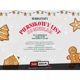 bilety: Zapraszamy na magiczne, pełne aromatu i świątecznej radości spotkanie, podczas którego przeniesiemy się prosto do bajkowego świata Mikołaja. "Piernikowy List do Mikołaja" to wyjątkowe wydarzenie, które połączy w sobie trzy najbardziej lubiane zimowe aktywności! W programie: Wydarzenia świąteczne artyści: Art SpaceZapraszamy wszystkie dzieci na niezapomniane świąteczne wydarzenie pełne radości, kreatywności i mikołajkowej magii! Bilety do nabycia na: KupBilecik.pl |