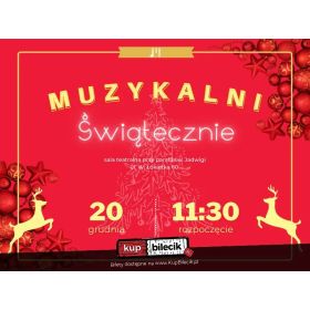 bilety: Serdecznie zapraszamy na Koncert Uczniów Muzykalni! Nasi dzielni uczniowie zaprezentują się na scenie w wielu odsłonach, a nieocenione wsparcie przyjaznej widowni doda im skrzydeł. Podczas koncertu usłyszymy utwory klasyczne, hity muzyki rozrywkowej i musicalowej. Koncert ma charakter charytatywny. Muzykalni Live artyści: Różni wykonawcyNasi dzielni uczniowie zaprezentują się na scenie w wielu odsłonach, a nieocenione wsparcie przyjaznej widowni doda im skrzydeł. Podczas koncertu usłyszymy utwory świąteczne, hity muzyki rozrywkowej i musicalowej. Koncert ma charakter charytatywny. W tym roku wspieramy Fundację “Zupa na Plantach”, która pomaga osobom doświadczającym bezdomności. Bilety do nabycia na: KupBilecik.pl |