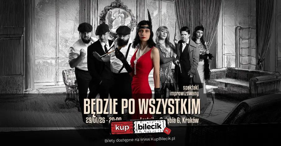 | Będzie po wszystkim - gangsterski spektakl improwizowanydodano 2026-01-12 19:13:33 Zapraszamy na pełnometrażowy spektakl improwizowany, który przeniesie Was w gangsterski świat pełen intryg, napięcia i… niespodziewanych zwrotów akcji! Przenieś się z nami w nieprzewidywalny czas lat międzywojennych. Ta historia rozegra się tylko raz - na Waszych oczach! Grupa Improwizacyjna Jakkolwiek artyści: Grupa Improwizacyjna JakkolwiekTworzymy improwizowane spektakle fabularne na podstawie Twoich sugestii.Żadne z nas nie ma pojęcia jak potoczą się losy bohaterów, ani jak na wypowiedziane na scenie słowa zareaguje druga osoba. Każda historia jest niepowtarzalna, a postacie z krwi i kości - mają swoje rozterki, marzenia, lęki i cele. Nasze opowiadanie raz może Cię rozbawić, innym razem wzruszyć, kolejnym znów dać do myślenia... A jak będzie tym razem? Tego nie wiemy! Liczymy na Twoją pomoc! Zapraszamy na nasze spektakle! Bilety do nabycia na: KupBilecik.pl |