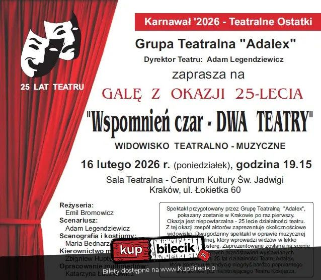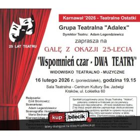 bilety: Spektakl przygotowany przez Grupę Teatralną "Adalex", pokazany zostanie w Krakowie po raz pierwszy. Okazja jest niepowtarzalna - 25 lecie działalności teatru. Z tej okazji zespół aktorów zaprezentuje okolicznościowe widowisko. Dwugodzinny spektakl w oprawie muzycznej i multimedialnej, który wprowadzi widzów w lekko nostalgiczną atmosferę. Wspomnień czar - DWA TEATRY artyści: Grupa Teatralna "Adalex"Spektakl przygotowany przez Grupę Teatralną "Adalex", pokazany zostanie w Krakowie po raz pierwszy. Okazja jest niepowtarzalna - 25 lecie działalności teatru. Z tej okazji zespół aktorów zaprezentuje okolicznościowe widowisko. Dwugodzinny spektakl w oprawie muzycznej i multimedialnej, który wprowadzi widzów w lekko nostalgiczną atmosferę. Zaprezentowane zostaną na scenie fragmenty różnych przedstawień wystawianych na przestrzeni 25 lat działalności Teatru Adalex, który kontynuuje tradycję niegdyś bardzo popularnego w Krakowie, już nieistniejącego Teatru Kolejarza. Bilety do nabycia na: KupBilecik.pl |
