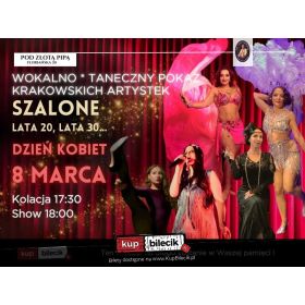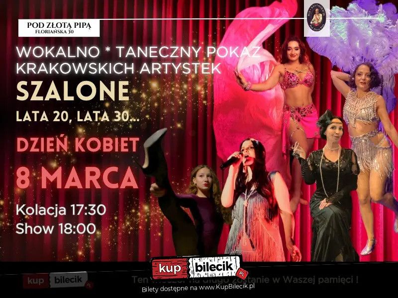 bilety: Zapraszamy na niezwykły wieczór pełen muzyki, tańca i wyśmienitej kolacji w naszych klimatycznych wnętrzach. To wydarzenie przygotowaliśmy specjalnie z okazji Dnia Kobiet. Kolację rozpoczynamy o 17:30, a spektakl o 18:00. "Szalone lata 20. lata 30." to elegancki spektakl wokalno-taneczny w wykonaniu artystek krakowskich, inspirowany atmosferą kabaretów i rewii międzywojnia. Lata 20. i 30. były w Polsce czasem niezwykle barwnym - pełnym muzyki, tańca i radości życia. Kolacja Do wyboru: