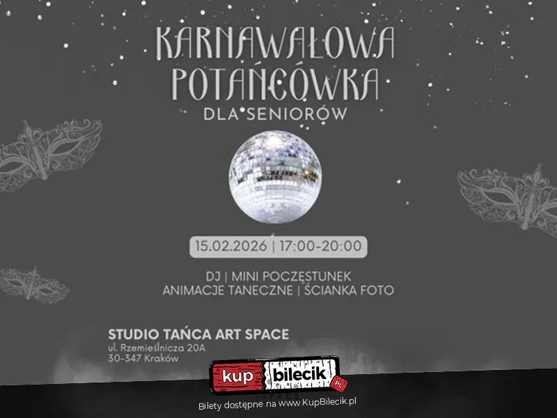 bilety: Serdecznie zapraszamy Seniorów na miłe, karnawałowe spotkanie przy muzyce i tańcu. To doskonała okazja, aby wyjść z domu, spędzić czas w sympatycznym gronie, porozmawiać, potańczyć i po prostu dobrze się bawić. Bal Karnawałowy artyści: Art SpaceZapraszamy na pełen kolorów, muzyki i śmiechu Bal Karnawałowy! Bilety do nabycia na: KupBilecik.pl |