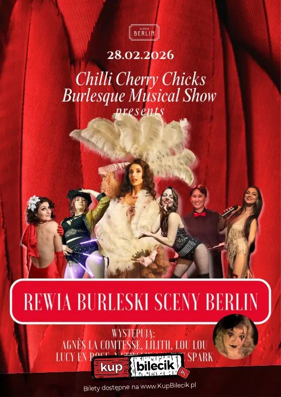 | Rewia Burleski Sceny Berlindodano 2026-02-12 11:13:53 Scena Berlin zaprasza na wyjątkowy wieczór pełen burleski, confetti i brokatu, gdzie kobieca siła spotyka się z elegancją, zmysłowością i scenicznym rozmachem. Rewia Burleski Sceny Berlin to spektakl, który zachwyca różnorodnością form, muzyką, ruchem i niepowtarzalną atmosferą glamour. Na scenie wystąpią olśniewające artystki zespołu Chilli Cherry Chicks: Agnes la Comtesse, Lou Lou i Lilith. Towarzyszyć im będzie energetyczny Burlesque Musical Show, w składzie: Lucy en Rose, Nathalie, Agni de Spark. Ten wieczór to prawdziwa uczta dla zmysłów: piękne artystki, spektakularne kostiumy, brokatowe stylizacje, confetti opadające ze sceny, taniec, śpiew i cyrkowe elementy tworzą razem niezapomniane widowisko. Gościem specjalnym wydarzenia będzie Owacja - charyzmatyczna i niezwykle utalentowana konferansjerka z Łodzi, która poprowadzi publiczność przez świat burleskowego blasku z humorem i klasą. W programie: Chilli Cherry Chicks Burlesque Revue artyści: Nokturna, Agnes la Comtesse, LuluTajemniczy labirynt podziemi Sceny Berlin w sercu starego Kazimierza kryje mroczne tajemnice. Słychać głosy, szepty, płacze i okrzyki grozy. Kilka dni temu, artyści występujący w tym teatrze, odkryli na ścianach przerażające napisy: "Strzeżcie się! Bowiem już 11 października oraz 15 i 16 listopada, zawsze punktualnie o godzinie 20:00, złe moce ujawnią masowo swe powabne oblicza. Duchy, duszyce i demony, obleczone w powabne szaty, odprawiać będą zakazane halloweenowe obrzędy. Osoby o słabych nerwach powinny zabezpieczyć się podwójną dawką prosecco! Nigdzie w królewskim Krakowie nie doświadczycie takich emocji!" Dalej, przeczytać było można napisane krwią serdeczną, że udział zapowiedziała wampirzyca Nokturna z Warszawy, a także upadła hrabianka Agnes la Comtesse, duch słynnej pieśniarki Lilith, a także uczestniczka orgii w willi cesarza Caliguli - Lulu! To one, cwałując na miotłach powiodą was na zatracenie w krainę zmysłowego grzechu i zepsucia! Bilety do nabycia na: KupBilecik.pl |