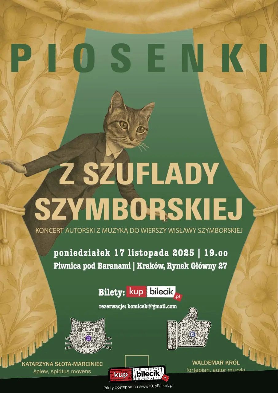 bilety: "Piosenki z szuflady Szymborskiej" to koncert złożony z kilkunastu piosenek, których słowa stanowią wiersze Wisławy Szymborskiej z różnych okresów jej twórczości. Od strony wykonawczej trudno je jednoznacznie "zaszufladkować" jest i nie jest to piosenka aktorska, jest i nie jest poezja śpiewana, nie całkiem kabaret, nie do końca rozrywka… Co twierdzą mieszkańcy wioski Jurgów? Jakie są upodobania eminencji we włoskiej Sienie i jakież preferencje chińskich dygnitarzy? Jaka będzie reakcja domorosłego majsterkowicza na próby wyrzucenia tego i owego z jego warsztatu? Obok wyśpiewania zabawnych absurdów zawartych w limerykach i rymowanych wierszach zatańczymy tango z Ludwikiem Flaszenem, opowiemy o problemach w królewskim pożyciu oraz, już poważnie, przedstawiamy historię Ludwiki Wawrzyńskiej. Zaśpiewamy też o miłości i innych "fragmentach ludzkiej rzeczywistości". Katarzyna Słota-Marciniec - śpiew, spiritus movens Waldemar Król - fortepian, autor muzyki Bilety do nabycia na: KupBilecik.plKatarzyna Słota-Marciniec & Waldemar Król artyści: Katarzyna Słota-Marciniec, Waldemar Król"Piosenki z szuflady Szymborskiej" to koncert złożony z kilkunastu piosenek, których słowa stanowią wiersze Wisławy Szymborskiej z różnych okresów jej twórczości. Od strony wykonawczej trudno je jednoznacznie "zaszufladkować"; jest i nie jest to piosenka aktorska, jest i nie jest poezja śpiewana, nie całkiem kabaret, nie do końca rozrywka… Co twierdzą mieszkańcy wioski Jurgów Jakie są upodobania eminencji we włoskiej Sienie i jakież preferencje chińskich dygnitarzy Jaka będzie reakcja domorosłego majsterkowicza na próby wyrzucenia tego i owego z jego warsztatu Bilety do nabycia na: KupBilecik.pl |