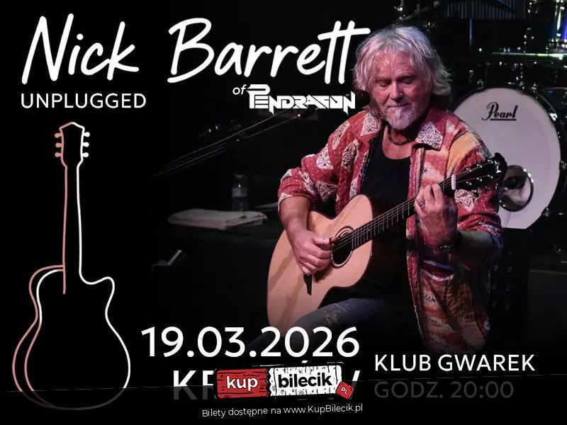 | Nazwa: Nick Barrett (Pendragon) - unpluggeddodano 2026-02-23 19:14:06 Założyciel, wokalista i gitarzysta zespołu Pendragon, już 19.03.2025 wystąpi w Krakowie w Klubie Gwarek. Repertuar akustyczny obejmujący utwory z całego przekroju działalności muzyka (w tym zespołu Pendragon), to nie lada gratka dla fanów twórczości brytyjskiego muzyka. Po świetnie przyjętym Pendragon Weekendzie w 2024 roku, zapraszamy na jedyny w swoim rodzaju koncert unplugged. Ten wieczór to niezwykła okazja, żeby obudzić w sobie zupełnie nowe emocje związane z twórczością artysty. Nick Barrett artyści: Nick BarrettNick Barrett - angielski muzyk, najbardziej znany jako założyciel, gitarzysta prowadzący, wokalista i główny autor piosenek progresywnego zespołu rockowego Pendragon, który powstał w 1978 roku w Stroud w hrabstwie Gloucestershire (początkowo pod nazwą Zeus Pendragon). Barrett dorastał w Stroud w południowo-zachodniej Anglii. W wieku 15 lat porzucił szkołę, odrzucając tradycyjną ścieżkę kariery na rzecz muzyki. Wspominał później, że spalił swoje podręczniki szkolne i powiedział doradcy zawodowemu, iż chce zostać gitarzystą rockowym na wzór Keitha Richardsa. W wieku 17 lat, w 1978 roku, założył z kolegami szkolnymi zespół Zeus Pendragon. Tego samego dnia grupa zagrała swój pierwszy koncert - wydarzenie, które Barrett określił jako jeden z najszczęśliwszych momentów w swoim życiu. Wkrótce nazwę skrócono do Pendragon. W czasach dominacji punk rocka zespół grający rock progresywny często spotykał się z niechęcią publiczności, jednak Barrett wytrwale rozwijał swoje inspiracje, czerpiąc m.in. z twórczości Genesis i innych klasycznych wykonawców prog rocka. Jak pokazuje historia - upór i wytrwałość Nicka zaowocowały wieloma świetnymi albumami i wielkim wkładem w światowy dorobek muzyczny. Podczas krakowskiego koncertu będziecie mogli przekonać się o tym sami! Bilety do nabycia na: KupBilecik.pl |