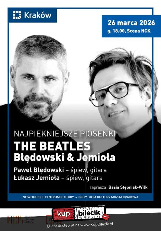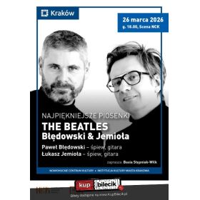 bilety: Błędowski & Jemioła (Paweł Błędowski i Łukasz Jemioła) - dwaj autorzy piosenek, którzy postanowili połączyć siły we wspólnym muzycznym projekcie. Pod szyldem "The Beatles Akustycznie" wykonują piosenki "Czwórki z Liverpoolu", której fanami są od dziecka. Pod koniec 2025 roku, nakładem Agencji Muzycznej Polskiego Radia i Radia Lublin, ukazał się także ich autorski album "Błędowski & Jemioła", który - jak sami twierdzą - zawiera "dwa głosy, dwie gitary oraz szczery i prosty przekaz". "The Beatles Akustycznie" to nie tylko koncert, ale także muzyczna podróż, która przypomni o uniwersalnym przesłaniu twórczości Beatlesów - miłości, radości i harmonii. Nastrojowe aranżacje, subtelne brzmienia akustyczne i kameralna atmosfera zapewnią niezapomniany wieczór. "The Beatles Akustycznie" to koncert, który łączy pokolenia i wprowadza w świat muzyki, która się nie starzeje. The Beatles - brytyjski rockowy zespół muzyczny z Liverpoolu, działający w latach 1960-1970 - ale piosenki The Beatles dalece przekroczyły tak granice Wielkiej Brytanii, jak i wszelkie ramy czasowe. Początek beatlemanii, z legendarnymi, histerycznymi reakcjami fanek, to rok 1963, a utwory grupy są także dziś niezwykle popularne, poruszają serca kolejnych pokoleń i nie milkną w naszej pamięci. W najbardziej aktywnym czasie działalności zespołu (1962-1969) w jego skład wchodzili: John Lennon - wokalista, gitarzysta, Paul McCartney - wokalista, gitarzysta basowy, multiinstrumentalista, George Harrison - gitarzysta i Ringo Starr - perkusista. Zdecydowaną większość utworów - teksty i muzykę - stworzyła spółka autorska Lennon/McCartney. Początkowo były to proste piosenki i opowieści o pierwszych miłościach, potem - m.in. pod wpływem spotkania z Bobem Dylanem - The Beatles zaczęli eksperymentować z brzmieniem, w aranżacjach pojawiły się instrumenty smyczkowe oraz egzotyczne (sitar), a w tekstach poważniejsze tematy. Ostatnie lata działalności to wyłącznie praca studyjna (pod koniec sierpnia 1966 zespół zawiesił koncertowanie), a jej efektem muzyka, w której znajdziemy mieszankę różnych stylów i gatunków. Albumy The Beatles błyskawicznie stawały się bestsellerami, koncerty na całym świecie (m.in.: USA, Kanada, Japonia, Hongkong, Szwecja, Europa Zachodnia, Australia) przyjmowane były z euforią, choć pod koniec tej kilkuletniej działalności zespołu nie brakowało wrogich reakcji i bojkotów ich muzyki. Dziś jednak na całym globie rozpoznawalne są największe przeboje Beatelsów - "Yesterday", "Hey Jude", "All you need is love", "Let it be" i wiele innych piosenek. Jak napisał po latach ich agent prasowy "Byli najwspanialszą powieścią dwudziestego wieku, która wydarzyła się naprawdę". Wystąpią: Łukasz Jemioła & Paweł Błędowski artyści: Paweł Błędowski, Łukasz JemiołaBłędowski & Jemioła (Paweł Błędowski i Łukasz Jemioła) - dwaj autorzy piosenek, tworzący dotąd na własny rachunek, postanowili połączyć siły we wspólnym projekcie. Wcześniej połączyło ich wspólne śpiewanie piosenek zespołu The Beatles, którego fanami są od dziecka. Ponieważ od wielu lat i Paweł, i Łukasz piszą swoje utwory, wykonywanie ich w duecie było naturalną konsekwencją występów pod szyldem The Beatles Akustycznie. To wydarzenie to nie tylko koncert, ale także muzyczna podróż, która przypomni o uniwersalnym przesłaniu twórczości m.in. Beatlesów, Czerwonych Gitar i wielu innych - o miłości, radości i harmonii. Nastrojowe aranżacje, subtelne brzmienia akustyczne i kameralna atmosfera zapewnią niezapomniany wieczór. Od Beatlesów do Czerwonych Gitar to koncert, który łączy pokolenia i wprowadza w świat magii muzyki, która nigdy się nie starzeje. Bilety do nabycia na: KupBilecik.pl |