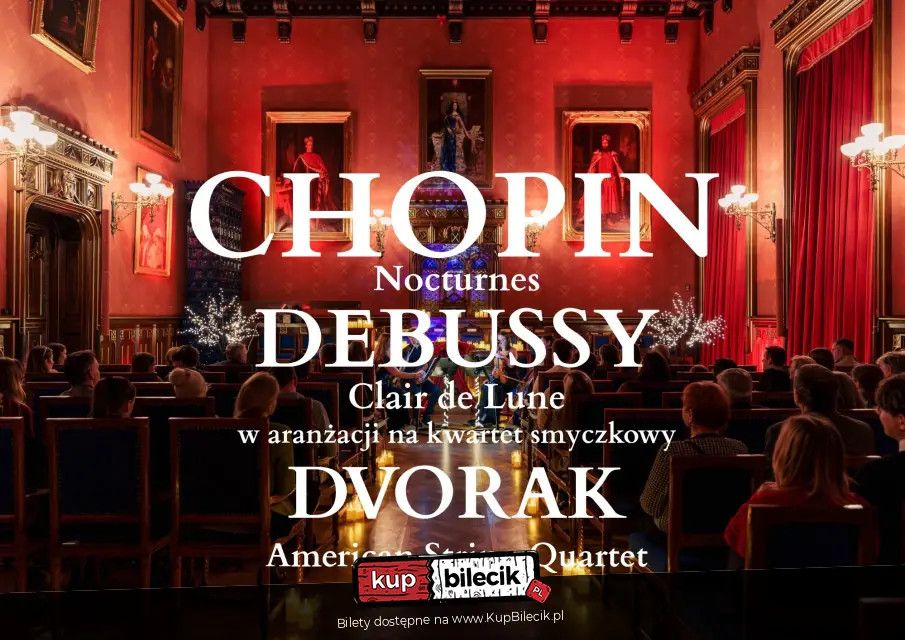 bilety: Zapraszamy na wyjątkowy koncert kameralny, który przeniesie słuchaczy w subtelny, pełen emocji świat muzyki klasycznej. W eleganckiej przestrzeni Muzeum Narodowego w Krakowie zabrzmią najpiękniejsze kompozycje inspirowane nastrojem wiosny - pełne lekkości, liryzmu i głębokiej ekspresji. Chopin / Debussy / Dvořák artyści: Krakow Royal MusicZapraszamy na wyjątkowy koncert kameralny, który przeniesie słuchaczy w subtelny, pełen emocji świat muzyki klasycznej. W eleganckiej przestrzeni Muzeum Narodowego w Krakowie zabrzmią najpiękniejsze kompozycje inspirowane nastrojem wiosny - pełne lekkości, liryzmu i głębokiej ekspresji. Na scenie wystąpi utalentowany kwartet smyczkowy artystów z Krakow Royal Music, który zaprezentuje starannie dobrany repertuar łączący romantyzm, impresjonizm i klasyczną formę. Bilety do nabycia na: KupBilecik.pl |