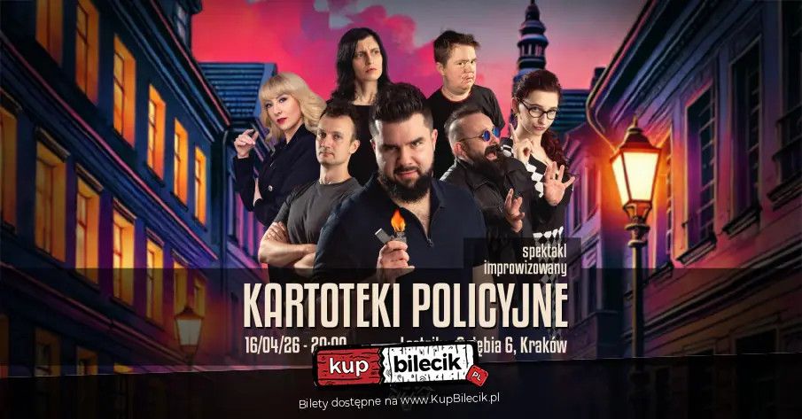 | Kartoteki policyjne - improwizowany spektakl kryminalnydodano 2026-04-07 19:13:50 W starym archiwum ktoś odnajduje zapomnianą teczkę - sprawę, której nigdy nie rozwiązano. Kilka pożółkłych zdjęć, odręczne notatki i jedno pytanie: co naprawdę wydarzyło się wtedy? Gdy śledztwo rusza na nowo, przeszłość zaczyna o sobie przypominać… Grupa Improwizacyjna Jakkolwiek artyści: Grupa Improwizacyjna JakkolwiekTworzymy improwizowane spektakle fabularne na podstawie Twoich sugestii.Żadne z nas nie ma pojęcia jak potoczą się losy bohaterów, ani jak na wypowiedziane na scenie słowa zareaguje druga osoba. Każda historia jest niepowtarzalna, a postacie z krwi i kości - mają swoje rozterki, marzenia, lęki i cele. Nasze opowiadanie raz może Cię rozbawić, innym razem wzruszyć, kolejnym znów dać do myślenia... A jak będzie tym razem? Tego nie wiemy! Liczymy na Twoją pomoc! Zapraszamy na nasze spektakle! Bilety do nabycia na: KupBilecik.pl |