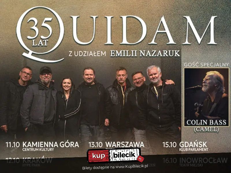 | Trasa jubileuszowa - 35 lat Quidam z udziałem Emilii Nazaruk. Gość specjalny Colin Bass (Camel)dodano 2026-04-09 19:15:53 Po ciepło przyjętej ubiegłorocznej trasie koncertowej z zespołem Amarok i niezwykle udanym koncercie na festiwalu Ino-Rock 2025, gdzie na scenie pojawili się też byli muzycy zespołu, Quidam postanowił uczcić swoje 35-lecie wyjątkową trasą koncertową, która obejmie 6 miast: Quidam artyści: Maciej Meller, Zbigniew Florek, Jacek Zasada, Mariusz Ziółkowski i inniQuidam - polski zespół muzyczny wykonujący rock progresywny i art rock. Założony na początku lat 90. w Inowrocławiu. Oprócz autorskiej działalności ma na swym koncie nagrania i koncerty z takimi sławami gatunku jak Colin Bass z grupy Camel czy polskim SBB. Bilety do nabycia na: KupBilecik.pl |
