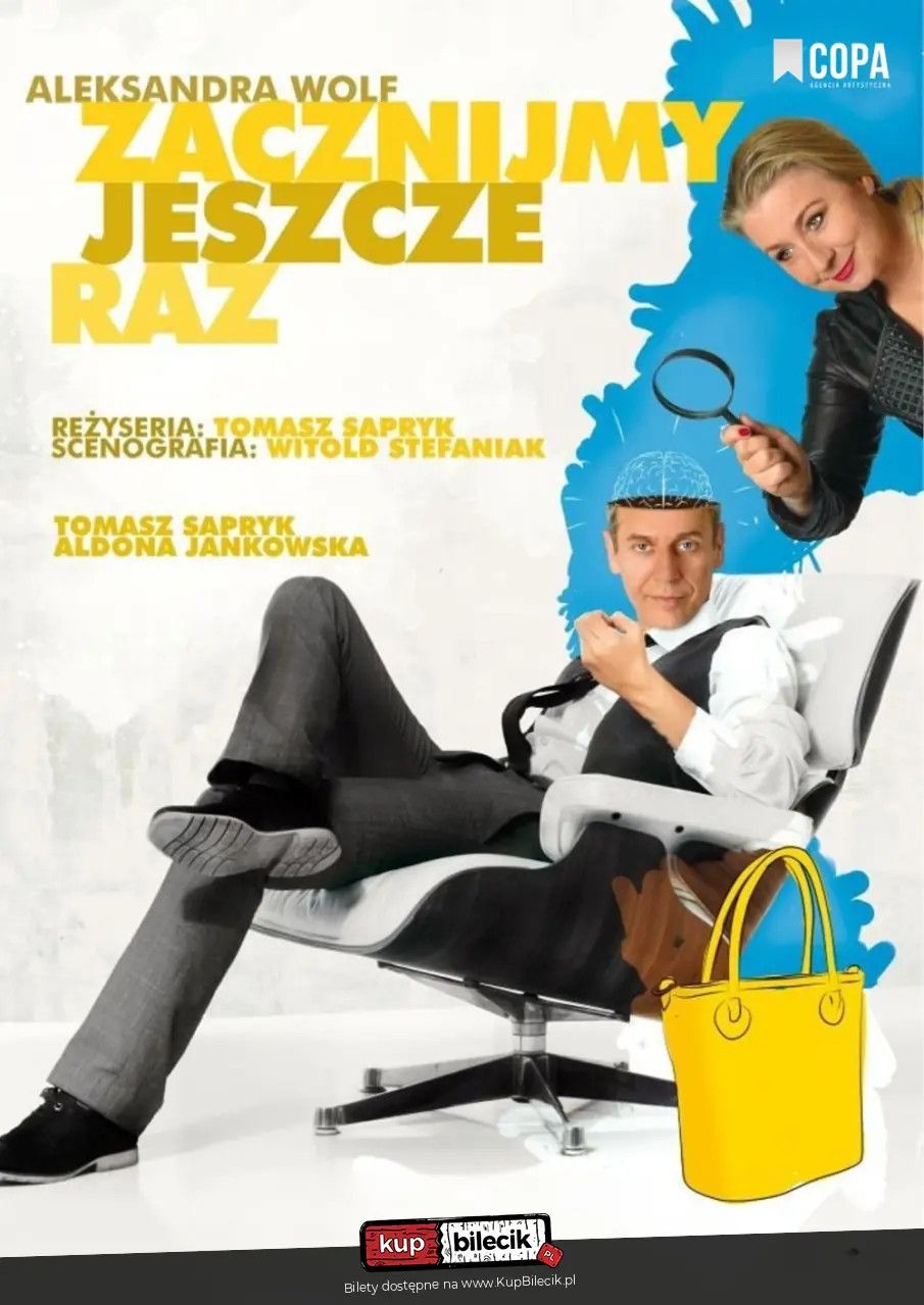 "Zacznijmy jeszcze raz" to komedia napisana specjalnie dla Aldony Jankowskiej i Tomasza Sapryka, przez Aleksandrę Wolf (autorkę tekstów do telewizyjnego kabaretu Rozmowy w Tłoku z programu "Szymon Majewski Show"). To spektakl, który przypłynął do Teatru Kamienica z Gdyni. Osadzony w jednym z najpiękniejszych polskich miast, oddaje atmosferę nadmorskiego kurortu. Spektakl otrzymał "Nagrodę Publiczności" na XI katowickim karnawale komedii. Bilety do nabycia na: KupBilecik.pl