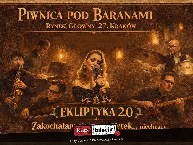 bilety: Ekliptyka 2.0 zaprasza na wyjątkowy wieczór muzyczny w legendarnej Piwnicy pod Baranami - miejscu, gdzie historia Krakowa spotyka się z artystyczną duszą jazzu. Koncert "Zakochałam się w czwartek… niechcący" to nastrojowa podróż do świata słynnych polskich szlagierów sprzed lat, odczytanych na nowo w jazzowych aranżacjach. Znane melodie zyskują tu świeże brzmienie, swing, improwizację i elegancki, klubowy klimat rodem z lat 20. i 30. XX wieku. Na scenie wystąpi sześcioosobowy zespół: To koncert dla miłośników polskiej piosenki, jazzu i nostalgii, dla tych, którzy chcą usłyszeć znane utwory w zupełnie nowym świetle i dać się porwać intymnej, nocnej atmosferze krakowskiej piwnicy. Wieczór pełen wspomnień, jazzu i nieoczywistej miłości do dawnych melodii. Bilety do nabycia na: KupBilecik.plEkliptyka 2.0 artyści: Filip Szostek, Jacek Śmietana, Andrzej Włodarz, Vasyl Kobil, Tomasz AdamczykEkliptyka 2.0, to formacja, która w "Piwnicy pod Baranami" dała się już poznać w repertuarze wokalnym, złożonym ze starannie wyselekcjonowanego zestawu polskich piosenek, od lat dwudziestolecia międzywojennego do końca dwudziestego wieku. Obecnie formacja zdecydowała się zaoferować swoisty "miks muzyczny" - częściowo oparty na wymienionym repertuarze (m.in. utworze, którego swoistą parafrazą jest tytuł koncertu), sięgający jednak dalej: w stronę standardów jazzowych takich autorów jak Stan Getz, czy John Coltrane, czy wreszcie utworów autorskich, utrzymanych w klimacie gatunku "smooth jazz". Bilety do nabycia na: KupBilecik.pl |
