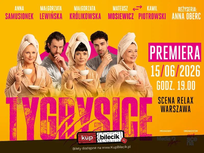 bilety: Trzy Kobiety. Przyjaźnią się od lat i wiedzą o sobie wszystko. No, może prawie wszystko. Gdy ich mężowie umierają, a PESEL zaczyna boleśnie dawać im się we znaki, postanawiają wziąć sprawy w swoje ręce i zawalczyć o siebie. Zamiast przekwitać, chcą rozkwitnąć. Obsada: Tygrysice artyści: Małgorzata Królikowska, Anna Samusionek, Małgorzata Lewińska i inniTrzy Kobiety. Przyjaźnią się od lat i wiedzą o sobie wszystko. No, może prawie wszystko. Gdy ich mężowie umierają, a PESEL zaczyna boleśnie dawać im się we znaki, postanawiają wziąć sprawy w swoje ręce i zawalczyć o siebie. Zamiast przekwitać, chcą rozkwitnąć. Wpadają na szalony pomysł, by zgłosić się do telewizyjnego show. Pragną zatańczyć i zaśpiewać przed milionami widzów. Chęci mają ogromne, gorzej z talentem. Na ratunek przychodzi im jednak przystojny śpiewak o hiszpańskich korzeniach. Julio roztacza przed nimi wizję wielkiej kariery, a przy okazji… rozpala w nich żar namiętności i coraz bardziej je w sobie rozkochuje. Czy któraś z nich zdobędzie jego serce Czy roztańczone wdowy staną się gwiazdami i podbiją świat Czy może to wszystko zakończy się gorącym czworokątem „Tygrysice” to komedia w gwiazdorskiej obsadzie, która bawi do łez i udowadnia, że wiek to tylko liczba, a w życiu nigdy nie jest na nic za późno. Bilety do nabycia na: KupBilecik.pl |